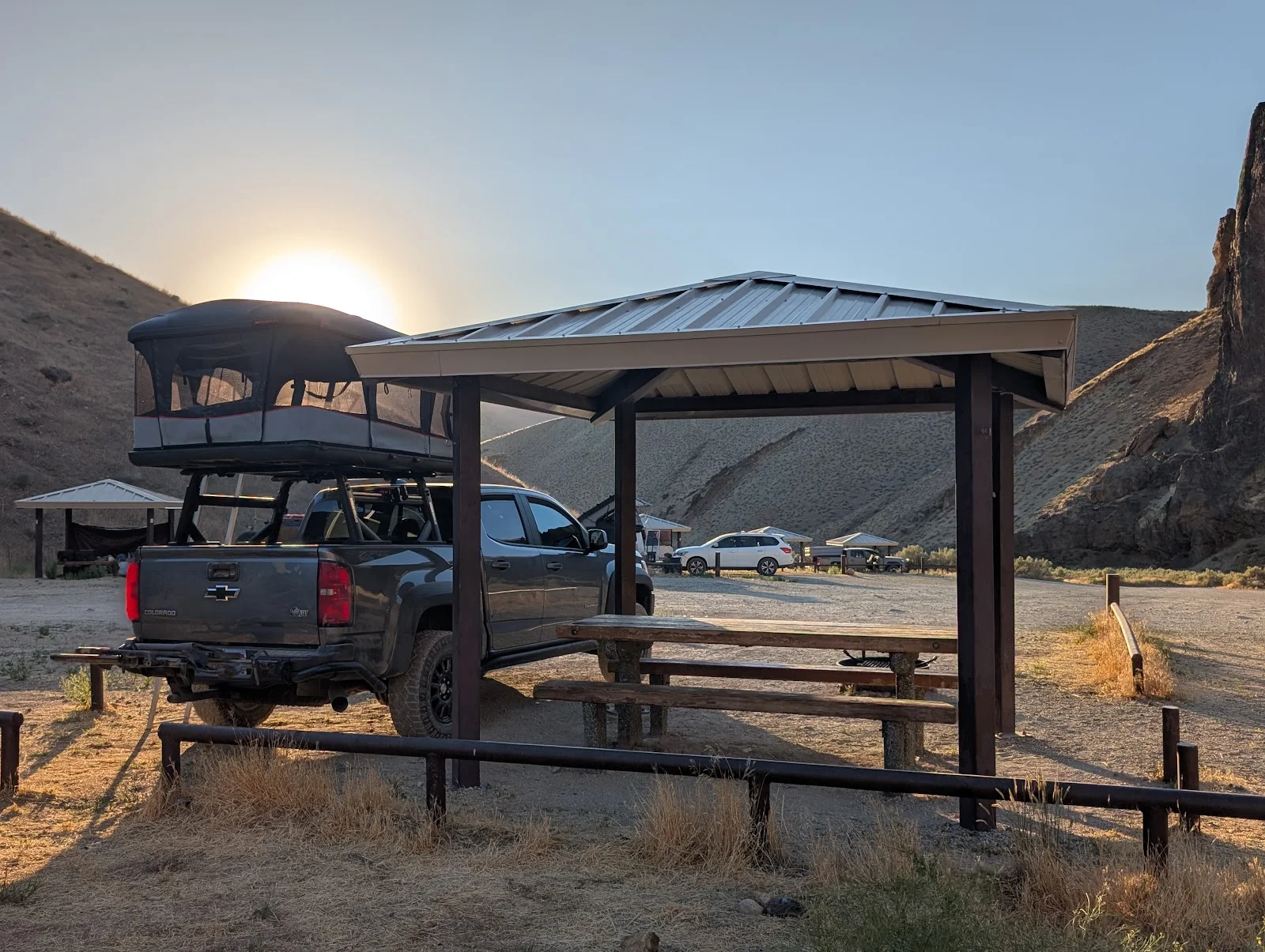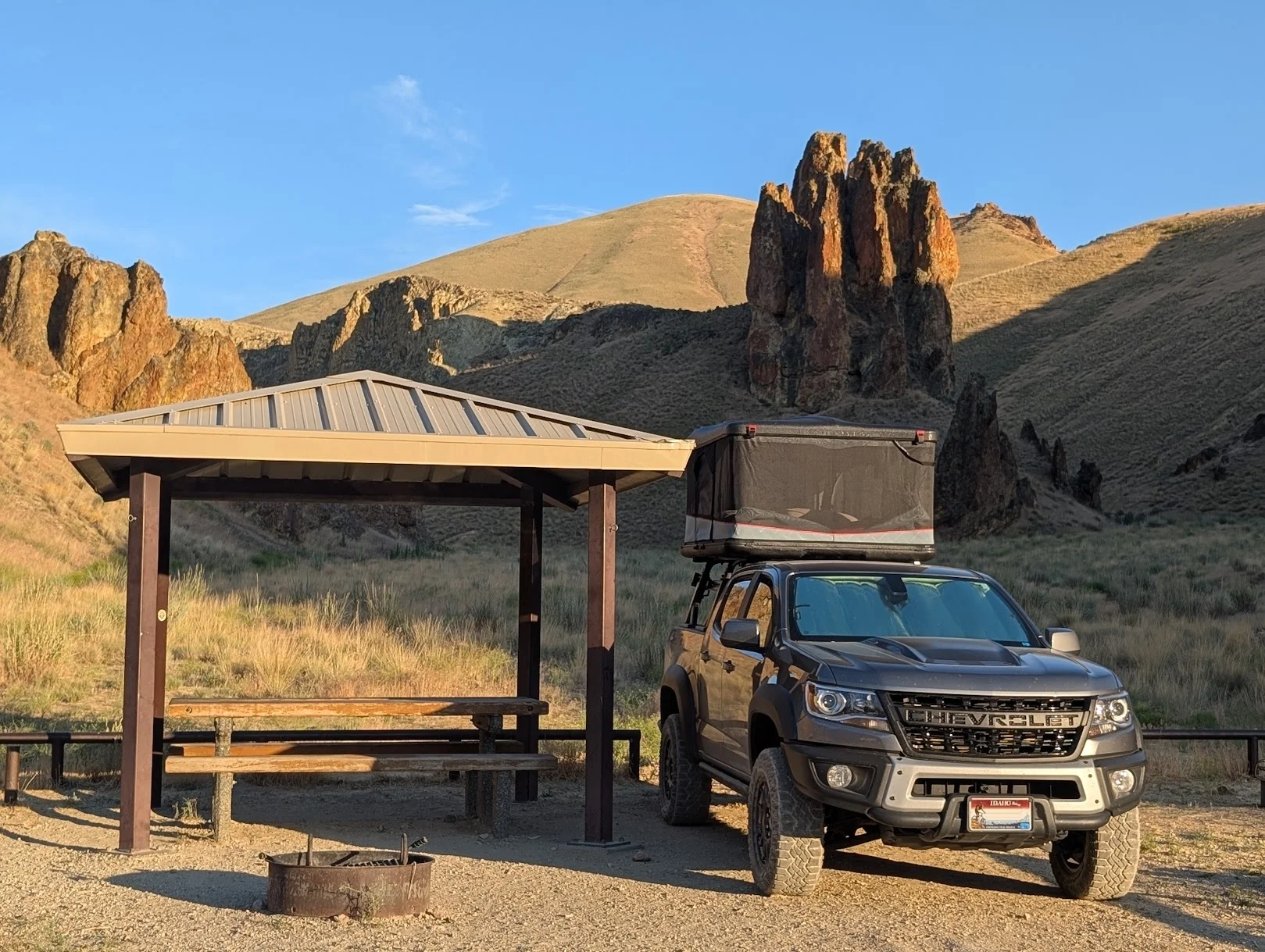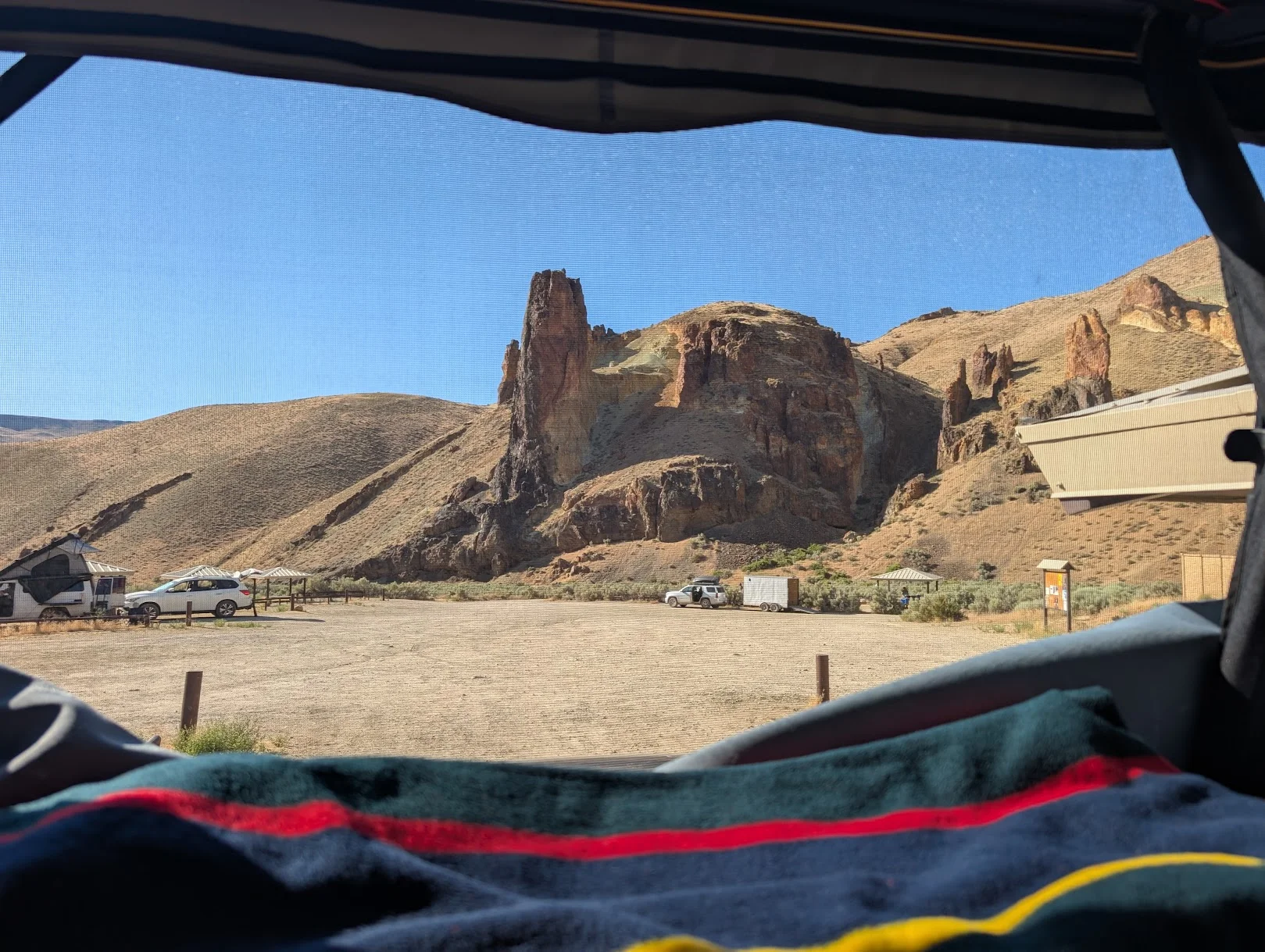 Leslie Gulch in Eastern Oregon has been on my list for a while. The geology is Martian, and at 2.5 hours away, it is close enough for an overnight. My only hesitation was about the weather. It was forecasted to be 100 degrees Fahrenheit! I knew that like my old Odyssey, my new Magma could be unzipped all around to allow maximum airflow and cooling. Plus, after some online digging I discovered a small camping area in Leslie Gulch called Slocum Creek Campground with big metal awnings at each campsite and a picnic table underneath. I also convinced myself that it was a Monday, the 25-mile dirt and sometimes very rough drive from I-95 was a barrier, and the forecast for soaring temperatures would all conspire to keep the masses away. I would be alone like dispersed camping but with shade.