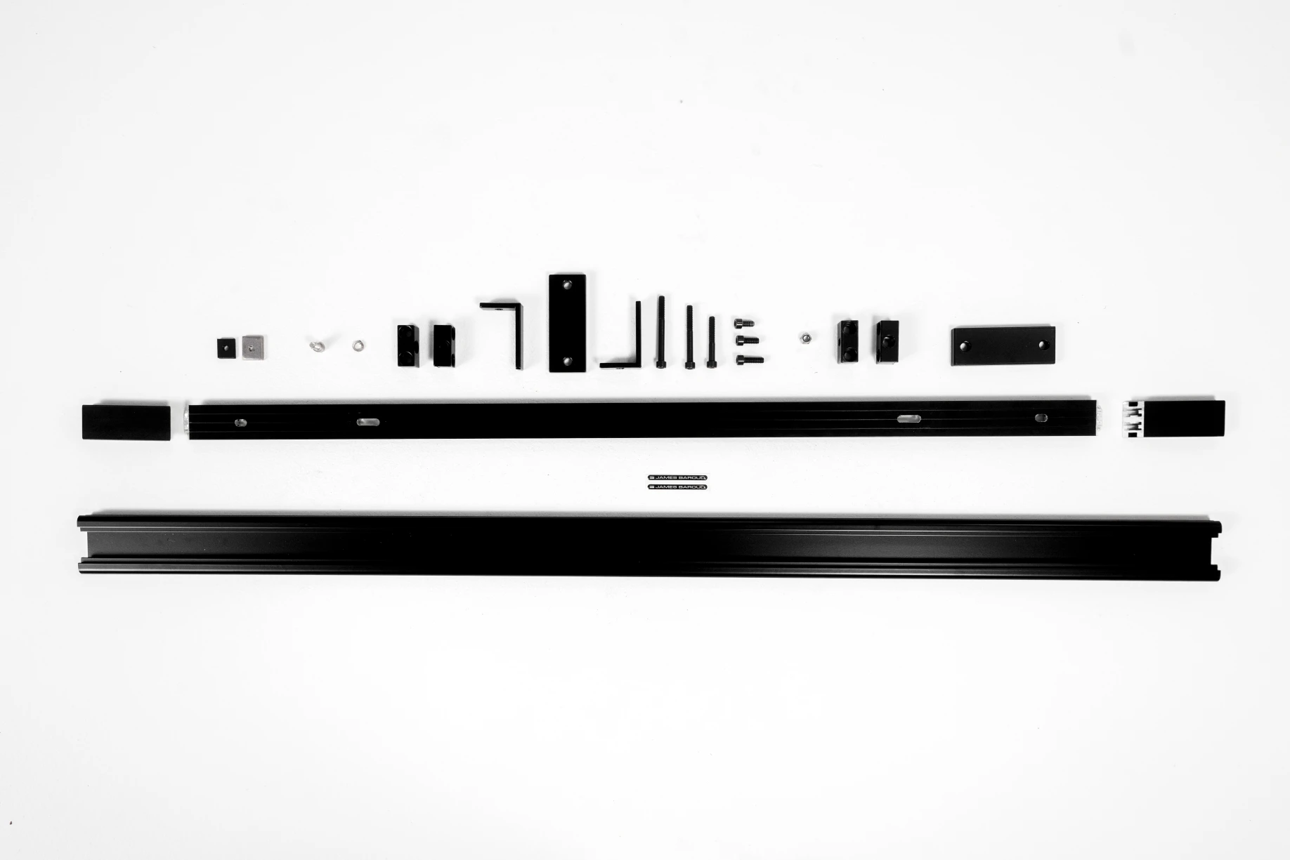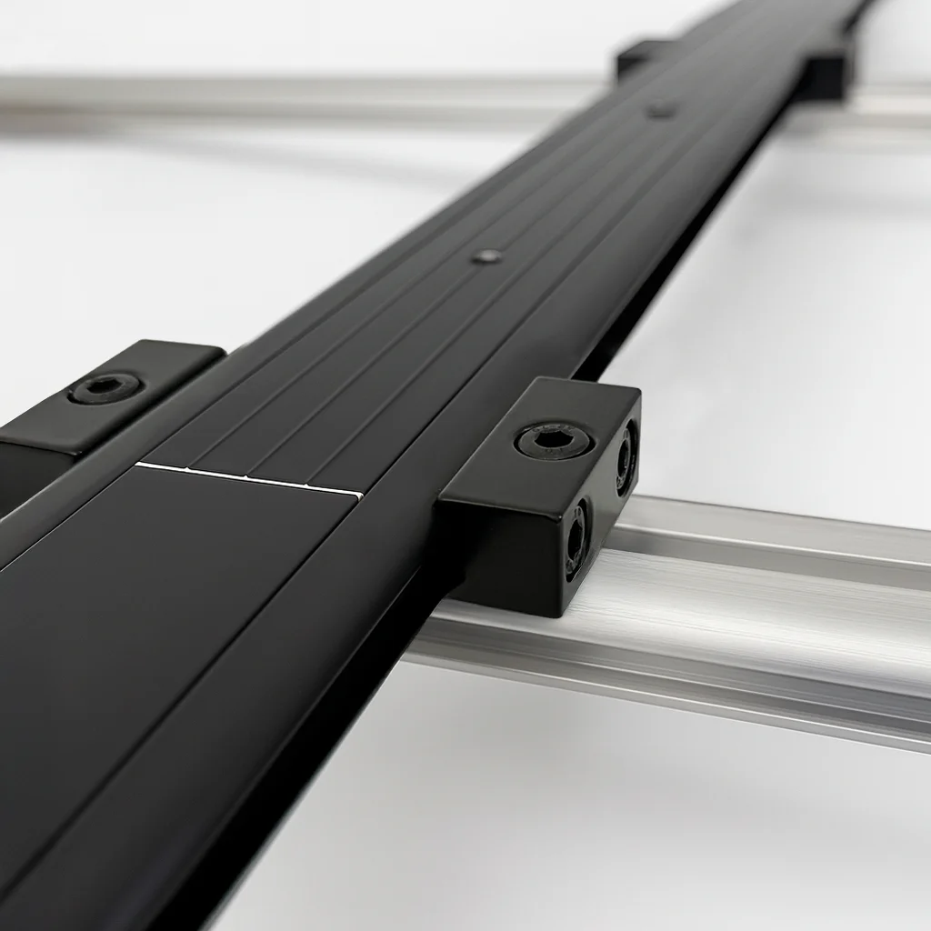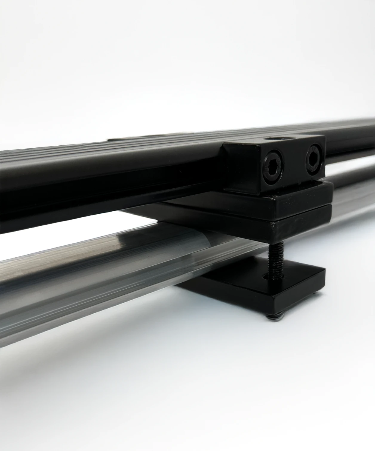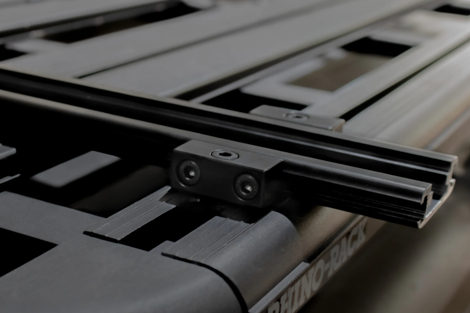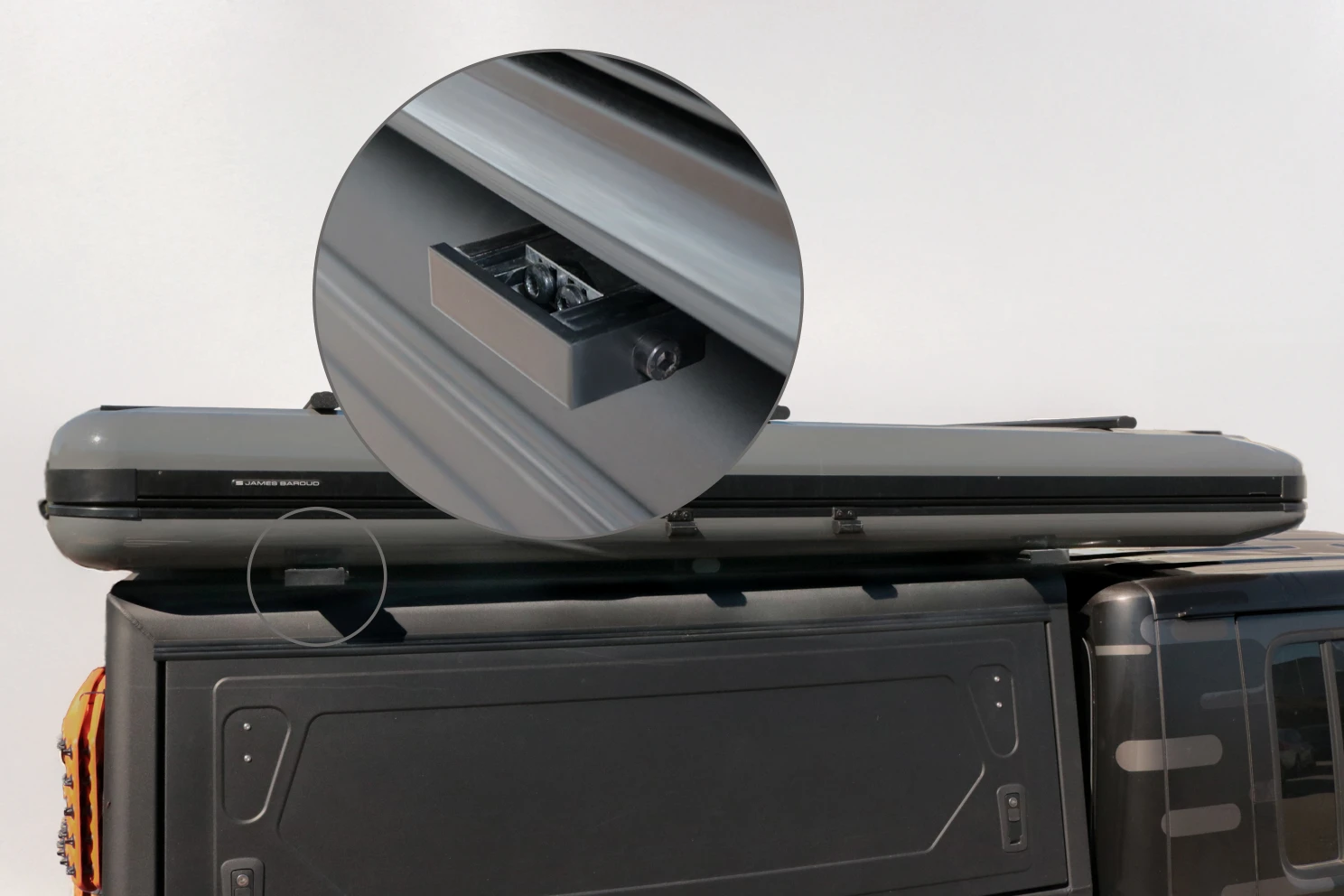 One aluminum profile mounts to the tent, the other to your bars or rack. Once aligned, the tent slides into place and tightens from the side, avoiding the awkward under-rack access of traditional systems. It is fast, secure, and ready for optional awning attachments.
